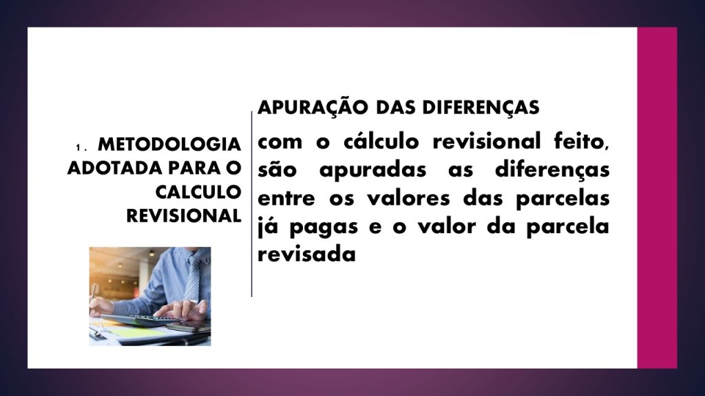 A metodologia CALCULO EXATO adotada para o calculo revisional está composta por 3 etapas: Realinhamento dos valores das parcelas contratuais com base na pesquisa junto ao sistema BACEN, Apuração das diferenças, Fixação do SALDO DEVEDOR corrigido.