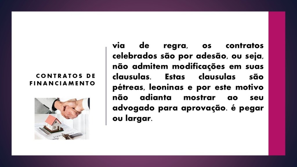 No Direito, os contratos de financiamento da casa própria se encaixam na categoria de POR ADESÃO. O que significa isto?