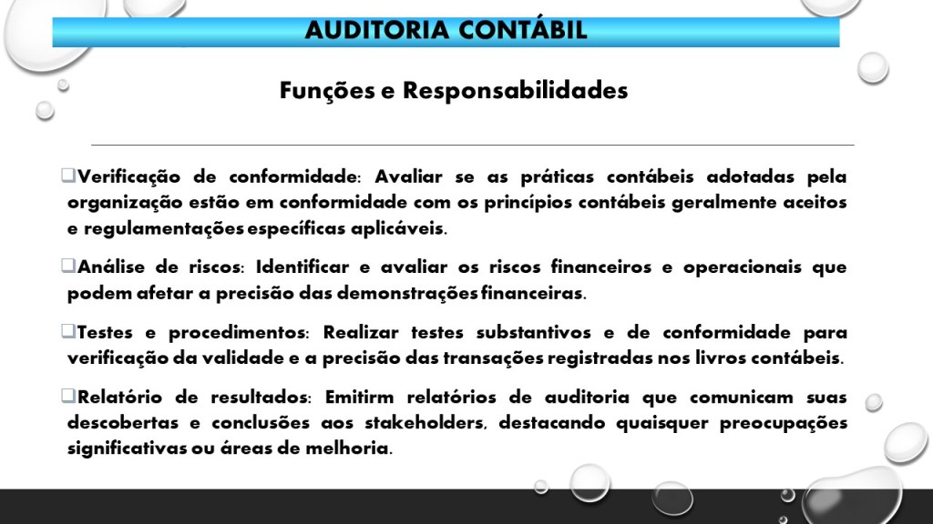 Os auditores contábeis têm responsabilidades distintas que incluem:
