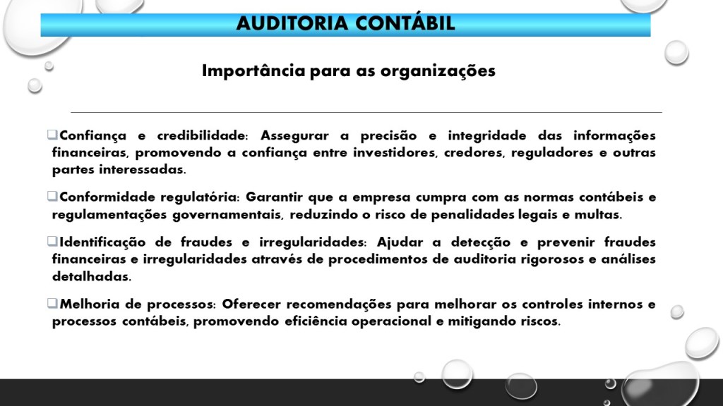 - Confiança e credibilidade: Assegura a precisão e integridade das informações financeiras, promovendo a confiança entre investidores, credores, reguladores e outras partes interessadas.