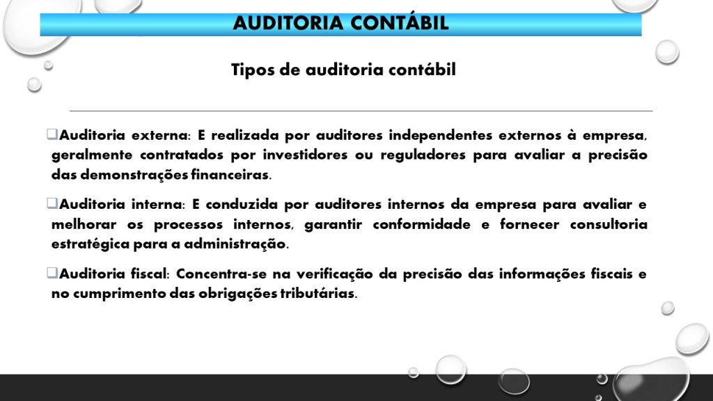 Existem diferentes tipos de auditoria contábil, incluindo: