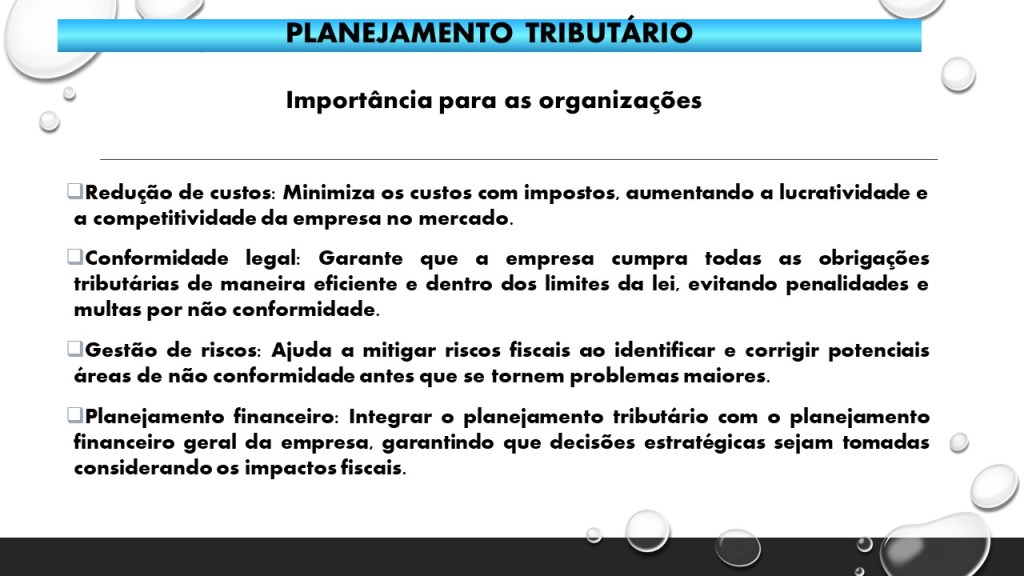 - Conformidade legal: Garante que a empresa cumpra todas as obrigações tributárias de maneira eficiente e dentro dos limites da lei, evitando penalidades e multas por não conformidade.