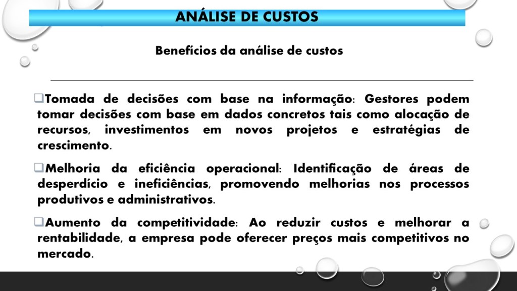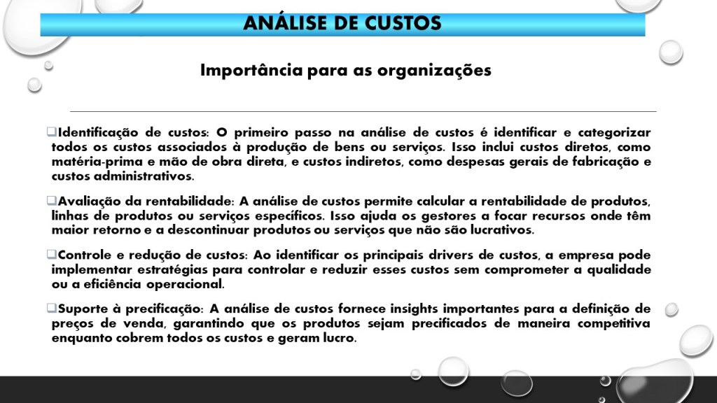- Suporte à precificação: A análise de custos fornece insights importantes para a definição de preços de venda, garantindo que os produtos sejam precificados de maneira competitiva enquanto cobrem todos os custos e geram lucro.