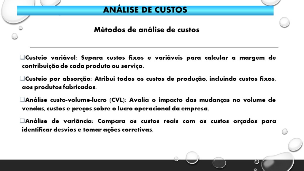 Existem vários métodos e técnicas utilizados na análise de custos, incluindo: