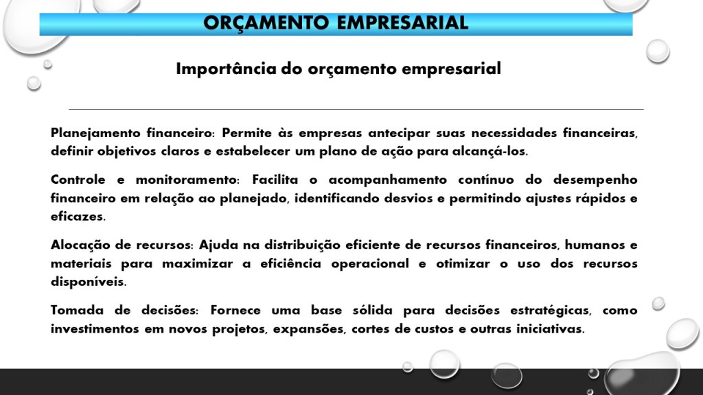 - Alocação de recursos: Ajuda na distribuição eficiente de recursos financeiros, humanos e materiais para maximizar a eficiência operacional e otimizar o uso dos recursos disponíveis.