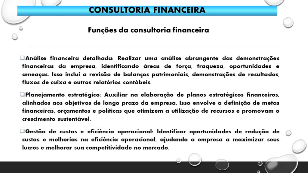 - Análise financeira detalhada: Consultores financeiros realizam uma análise abrangente das demonstrações financeiras da empresa, identificando áreas de força, fraqueza, oportunidades e ameaças. Isso inclui a revisão de balanços patrimoniais, demonstrações de resultados, fluxos de caixa e outros relatórios contábeis.
