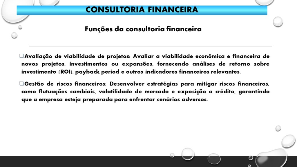 - Avaliação de viabilidade de projetos: Avaliam a viabilidade econômica e financeira de novos projetos, investimentos ou expansões, fornecendo análises de retorno sobre investimento (ROI), payback period e outros indicadores financeiros relevantes.