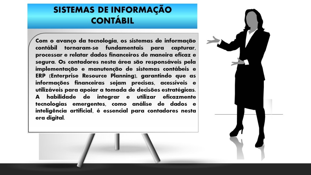 Com o avanço da tecnologia, os sistemas de informação contábil tornaram-se fundamentais para capturar, processar e relatar dados financeiros de maneira eficaz e segura. Os contadores nesta área são responsáveis pela implementação e manutenção de sistemas contábeis e ERP (Enterprise Resource Planning), garantindo que as informações financeiras sejam precisas, acessíveis e utilizáveis para apoiar a tomada de decisões estratégicas. A habilidade de integrar e utilizar eficazmente tecnologias emergentes, como análise de dados e inteligência artificial, é essencial para contadores nesta era digital.
