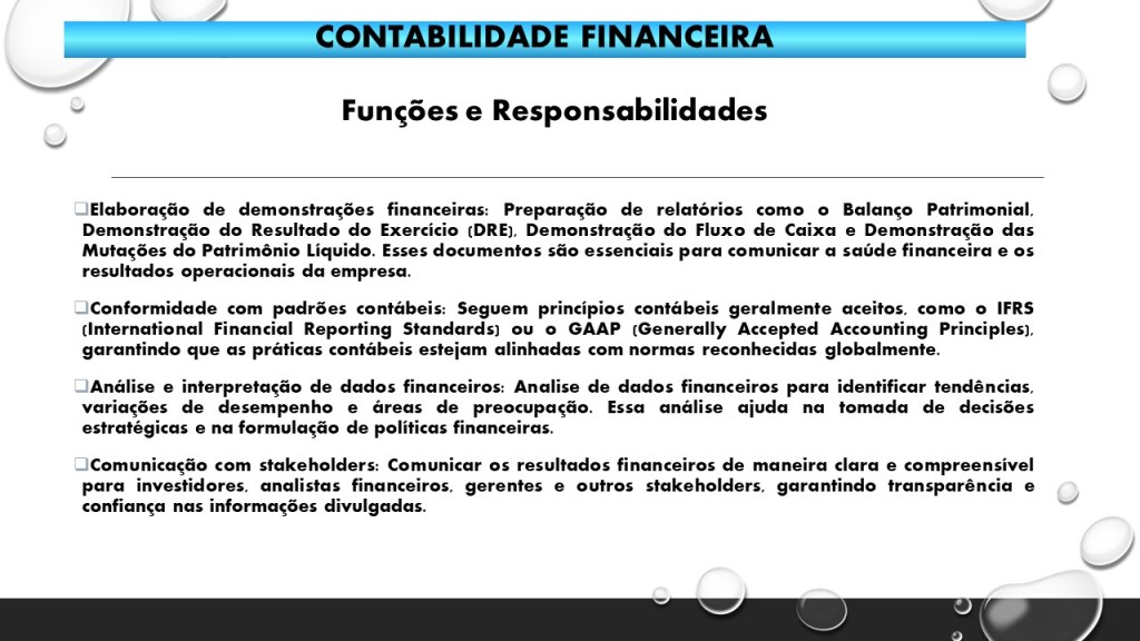 - Comunicação com stakeholders: Comunicam os resultados financeiros de maneira clara e compreensível para investidores, analistas financeiros, gerentes e outros stakeholders, garantindo transparência e confiança nas informações divulgadas.