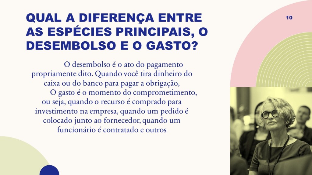 Qual a diferença entre as espécies principais, o desembolso e o gasto?