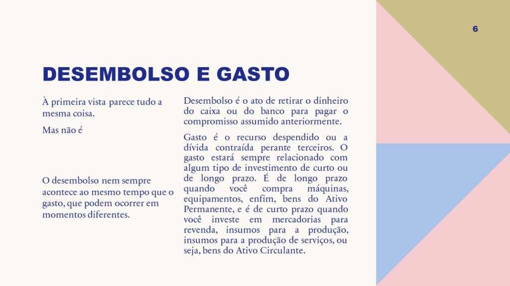 O desembolso nem sempre acontece ao mesmo tempo que o gasto, que pode ocorrer em momento diferente do gasto.