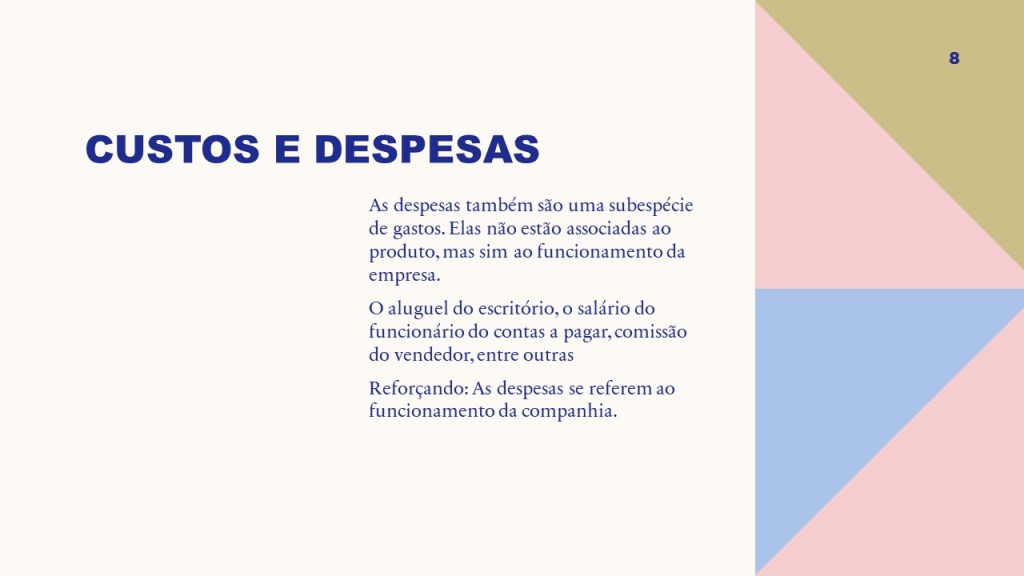 As despesas também são uma subespécie de gastos. Elas não estão associadas ao produto, mas sim ao funcionamento da empresa.