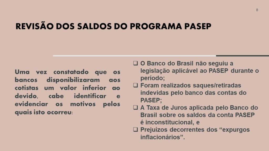 Quando julgou o tema PASEP no recurso repetitivo 1150 ( é assim que se chama: recurso repetitivo) o STJ deu ganho de causa aos cotistas PASEP comandando ao Banco do Brasil o ressarcimento pelas perdas financeiras sofridas pelos correntistas PASEP.