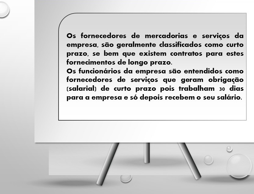 Os funcionários da empresa são entendidos como fornecedores de serviços que geram obrigação (salarial) de curto prazo pois trabalham 30 dias para a empresa e só depois recebem o seu salário.